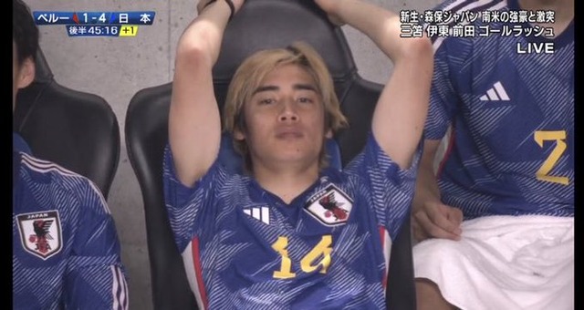 - ◆悲報◆日本代表FW伊東純也さん、ベンチに下がって気を抜いてるところをお茶の間に晒されてしまう😭
