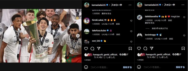 - ◆ブンデス◆鎌田大地のフランク退団報告インスタ投稿に吉田麻也、久保建英ら代表チームメイトやフランクの面々が続々コメント